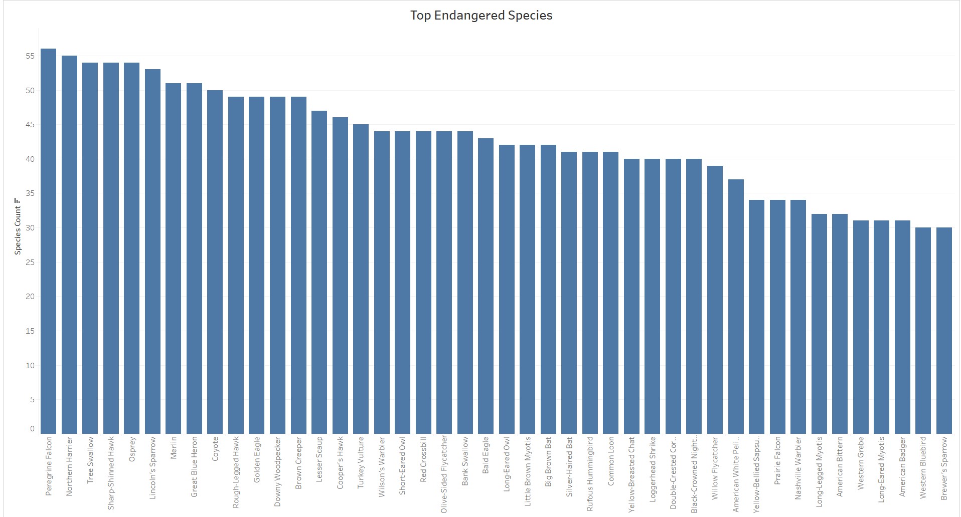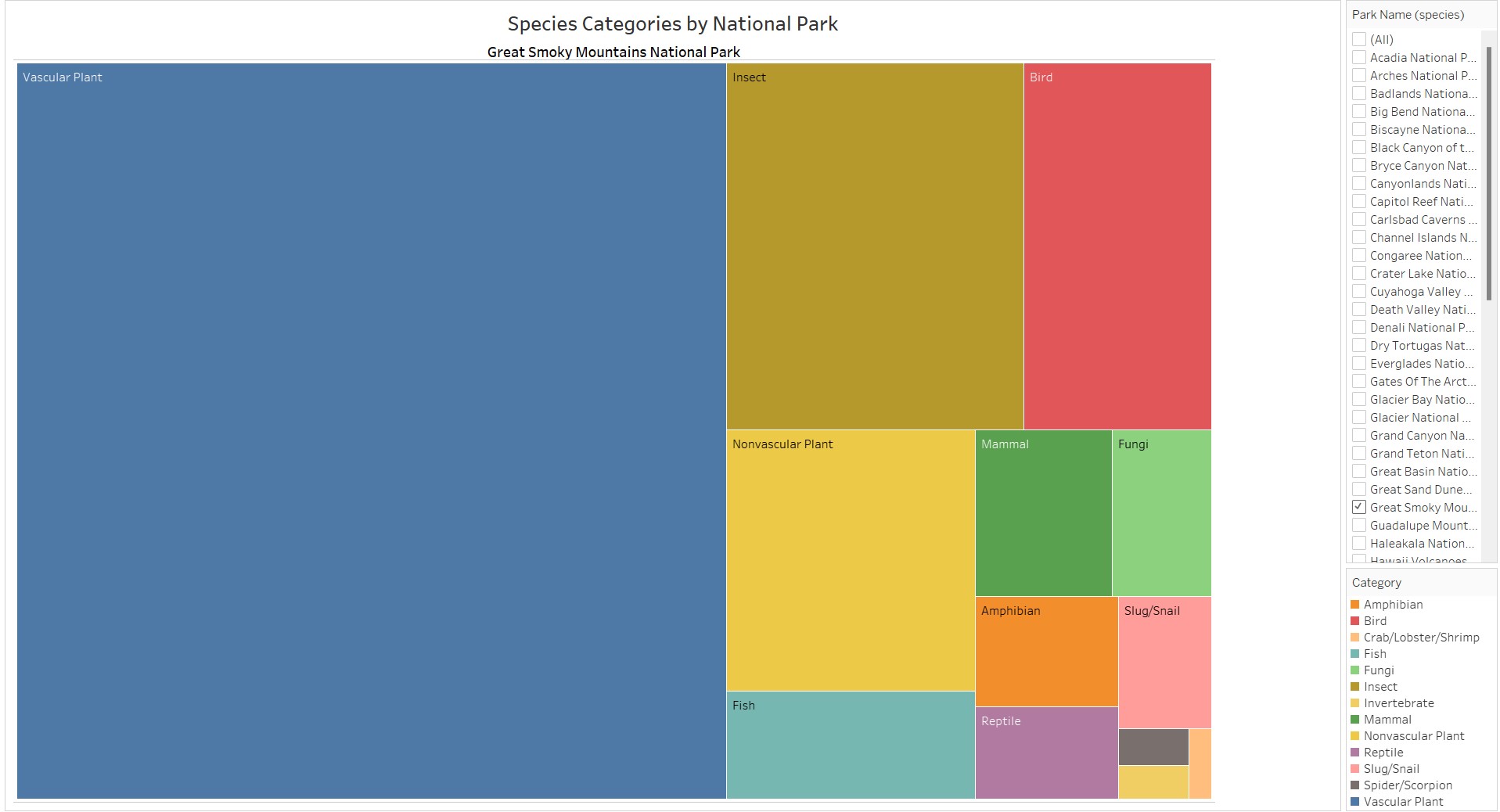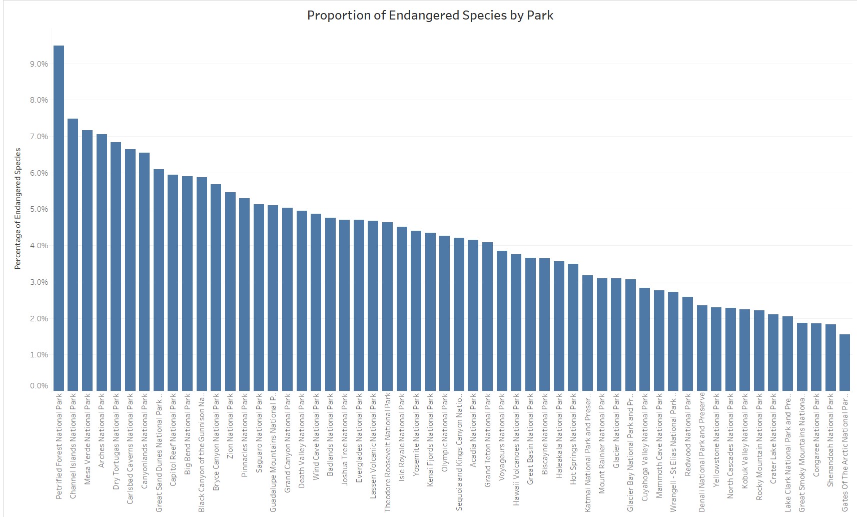 Biodiversity represents the foundation for healthy ecosystems around the world. National parks have historically played a vital role in preserving the diverse species that humans interact with and observe. This analysis sheds light on many important aspects of biodiversity in national parks in the United States, including the concentration of species amongst the parks and the challenges of endangered species. All data is downloaded from the Biodiversity dataset on Kaggle. View the Tableau dashboard here.