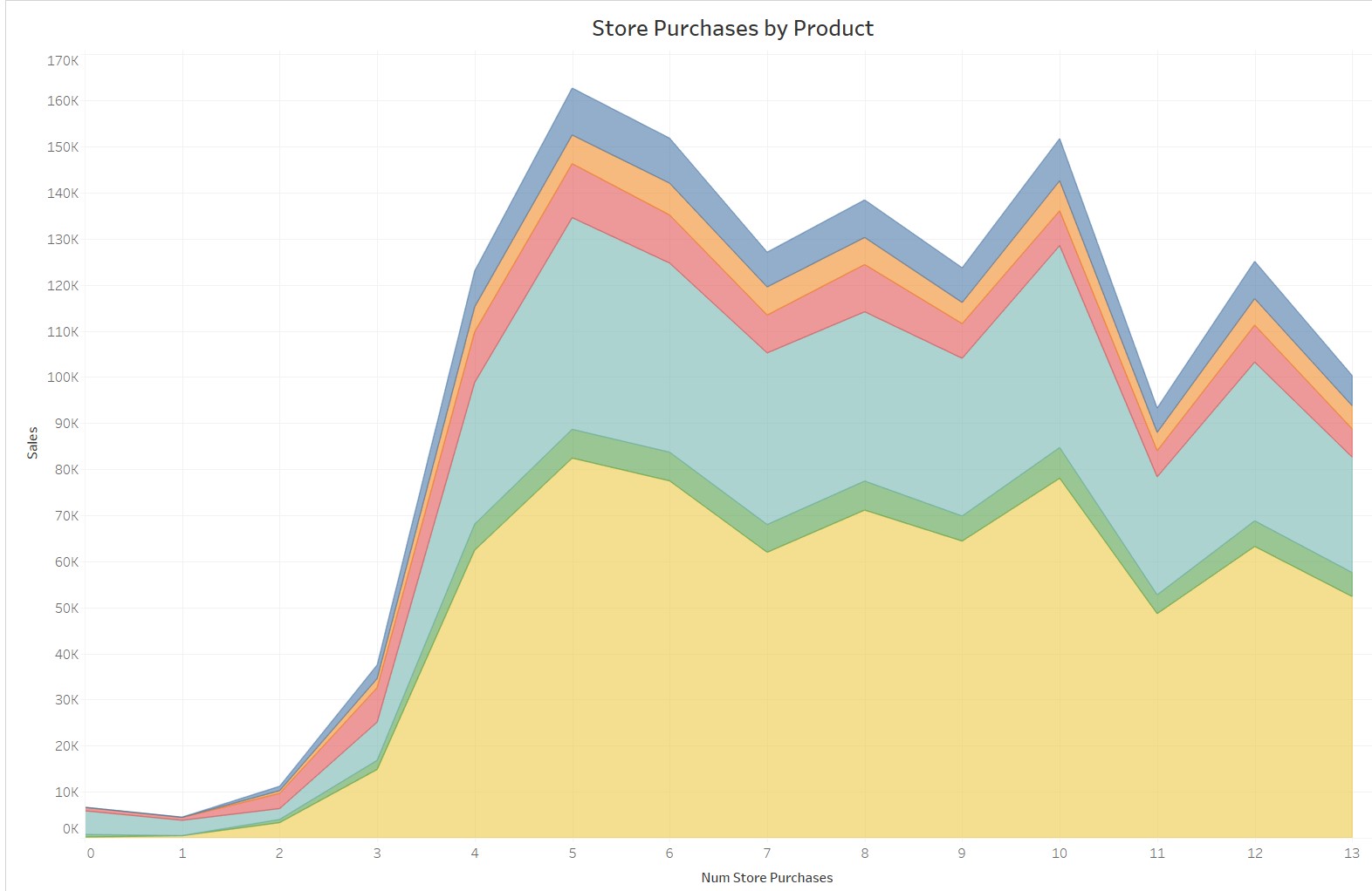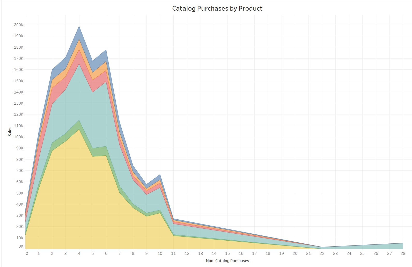 Because the first three graphs show a sharp decline over time, the store should work to promote products via these avenues for consistency. Web and catalog could increase due to a revised interface or online-exclusive coupons.
