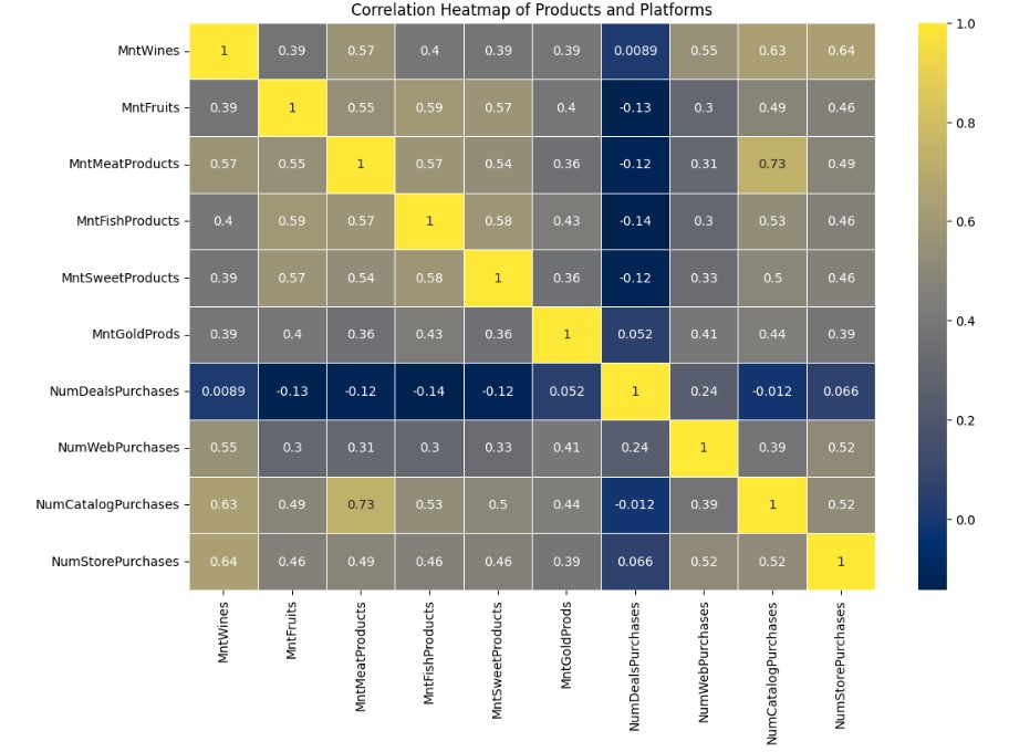 In order to understand any correlation between each of the products purchased, as well as the platform in which they were purchased, I created a heatmap in Python.