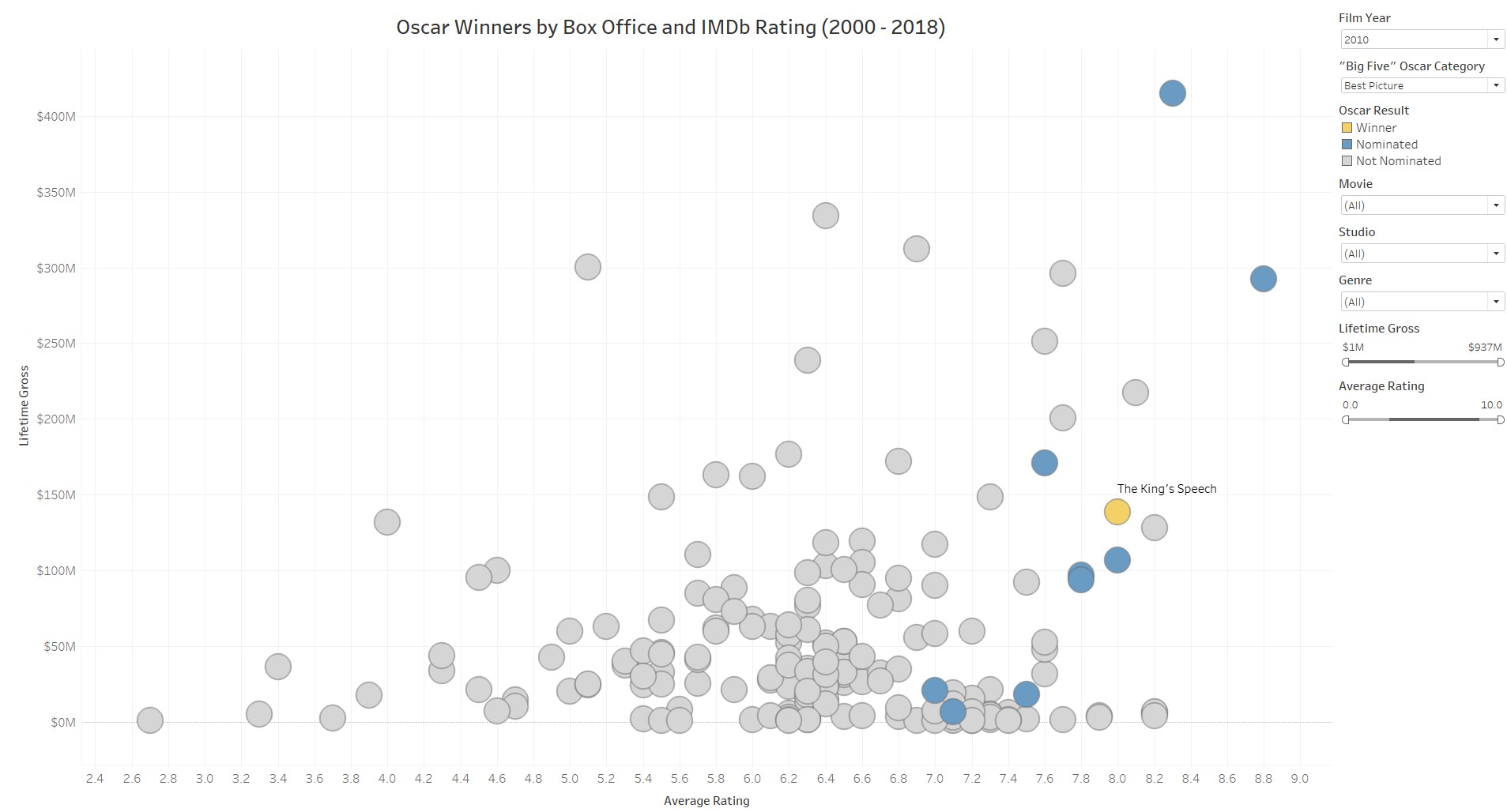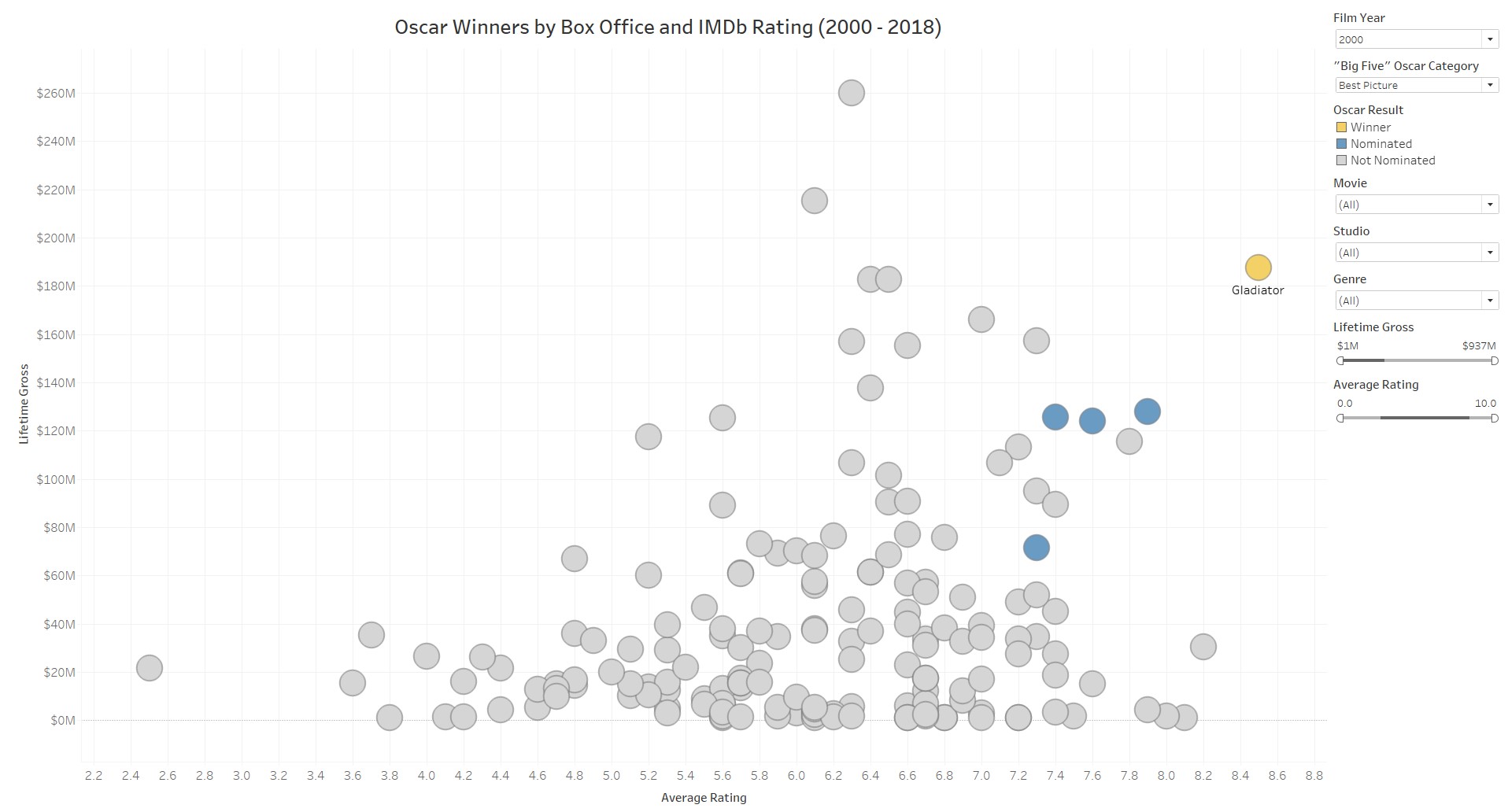 The Academy Awards have long been the source of fascination and inspiration for filmmakers and film watchers. Particularly, the "Big Five" categories of Best Picture, Best Director, Best Writing (Original and Adapted), Best Actor, and Best Actress have been of significant interest. This project analyzes two factors that could contribute to a film's success in these categories: IMDb ratings and box office revenue. Using data from 2000 to 2018, I highlight any notable insights about Academy Award winners. Data is downloaded from the IMDb website, Hollywood dataset, and Oscar dataset from Kaggle. View the Tableau dashboard here.